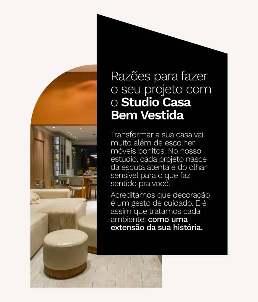 Valorizamos conversas diretas e intuitivas que nos conectam verdadeiramente ao que você deseja transformar. Essa escuta ativa torna o briefing mais leve e orgânico, permitindo insights profundos e soluções alinhadas ao seu estilo de vida e essência. Esse atendimento afetivo e fluido perdura ao longo de cada etapa do projeto.